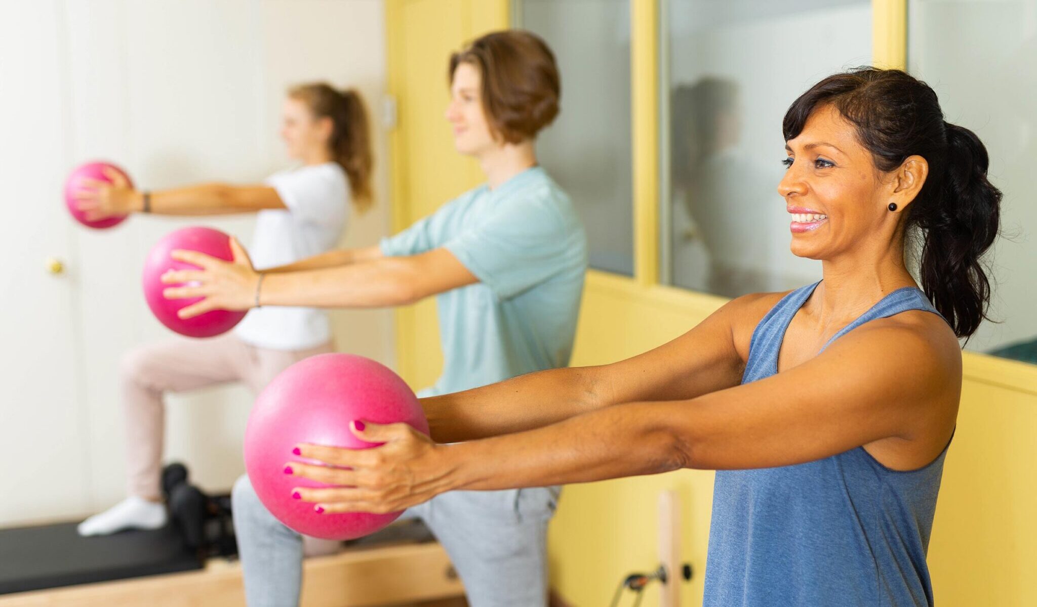 Pilates is a mindful exercise that promotes control of both the body and mind through a relaxed, focused approach. Many classes incorporate equipment such as the Reformer, Jump Board, resistance bands, and classic Pilates rings to enhance the workout. Typically practiced in small groups with an instructor, Pilates encourages participants to stay present, which can support mental well-being and self-care.